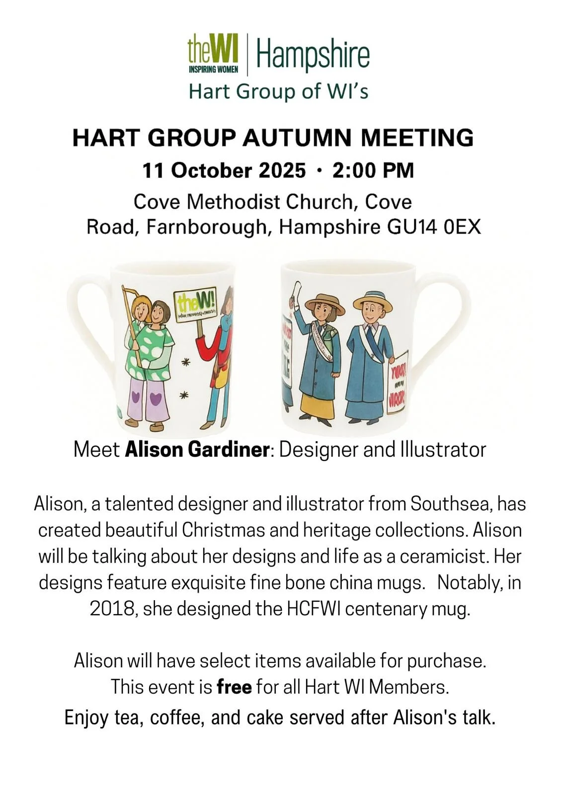 I am looking forward to the Hart Group meeting that will be held from 2pm on Saturday 11th October, in Cove Methodist Church Hall. This meeting is open to members of all the WIs that make up the Hart Group of WIs … that’s us and all the other WIs local to our area. Our own Rachel Neudegg has organised a speaker, the designer and illustrator, Alison Gardiner. Alison is probably best known for her fine bone china mugs, including her design for the Hampshire WI centenary mug. Entry is free, but you might want to bring along some money for tea and cake (of course there’s tea and cake – this is the WI!), and for the raffle. There will also be an opportunity to buy some of Alison’s beautiful designs (start thinking about Christmas presents now, ladies!). I hope you will be able to join us; if you would like to do so, please add your vote to the poll on the WI-Flyers WhatsApp group or let our Secretary, Tricia know.